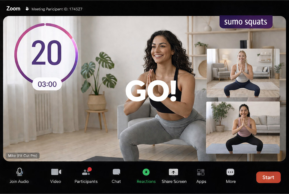 Fit Cut Pro's Zoom workout timer overlay transforms your live online training sessions. Display professional countdown timers, exercise names, and animated transitions directly in your Zoom call — giving your clients a studio-quality experience from anywhere.